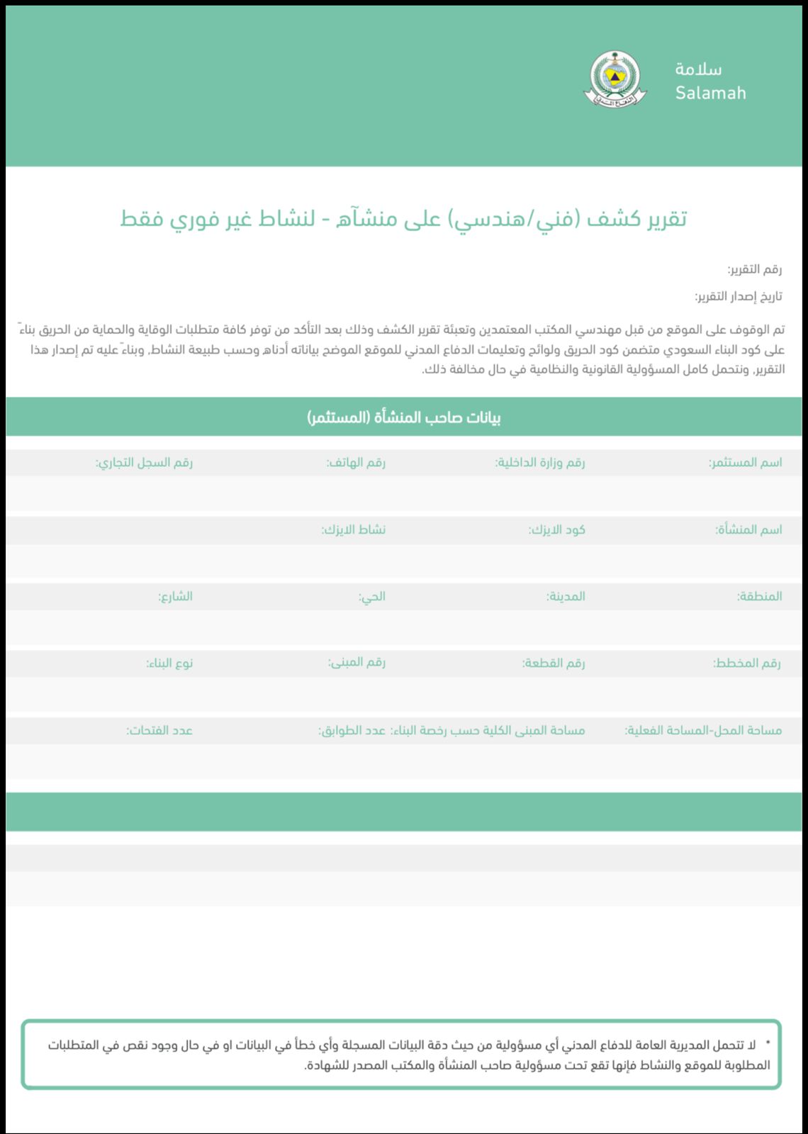 هو مستند يوضح الحالة الفنية للمنشأة من ناحية اشتراطات السلامة، ويُستخدم ضمن الإجراءات المرتبطة بالترخيص أو التجديد أو إثبات الجاهزية.