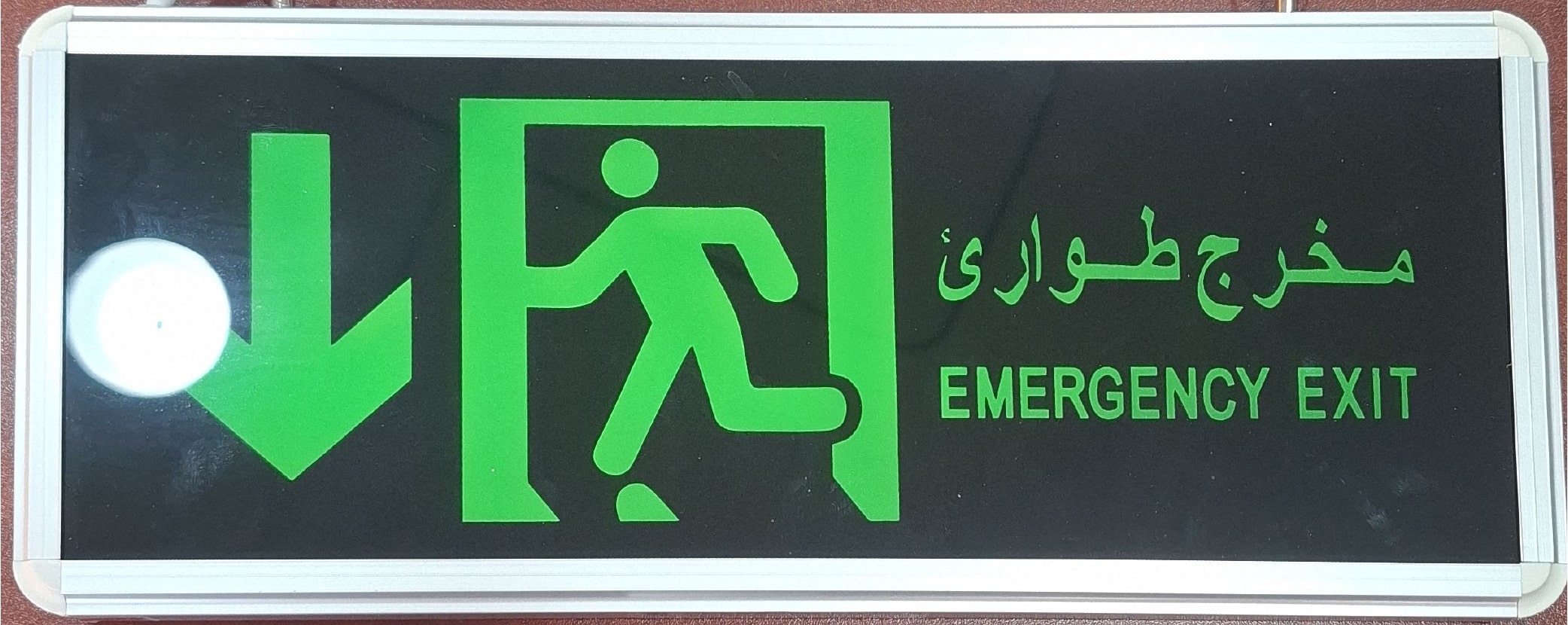• Equipped with bright green LED lighting to clearly display the word “Exit” in both Arabic and English, along with an arrow and running man symbol.